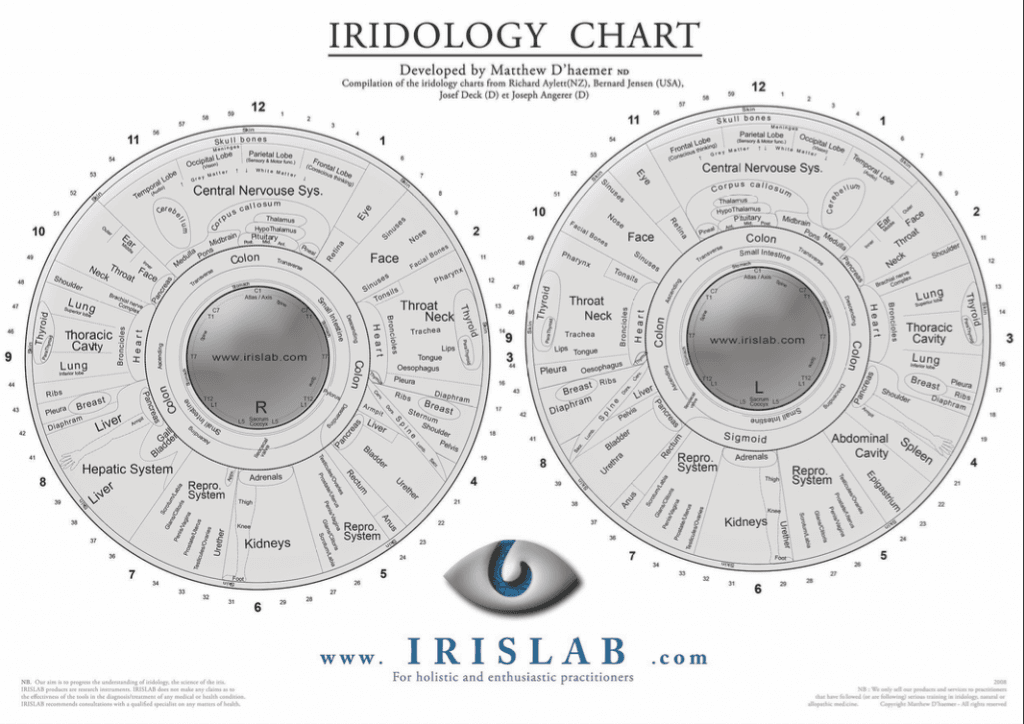 Iridology chart on this page shows the right eye iris zones as they relate to specific tissues & organs in the body from Dr. Jenson’s Iridology charting studies