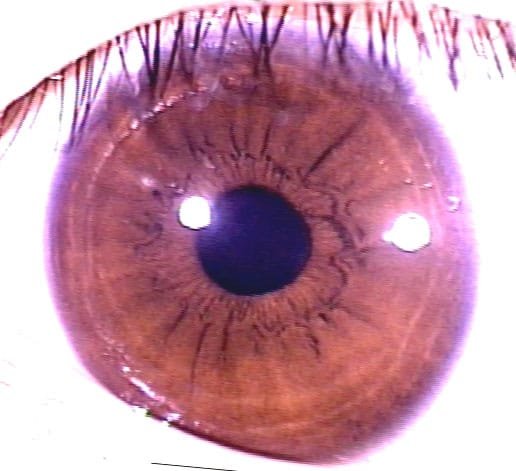Very dark thick circle around the pupil border indicating a problem with very low HCL acid in the stomach. This could cause problems with bloating and flatulence after a high protein meal.